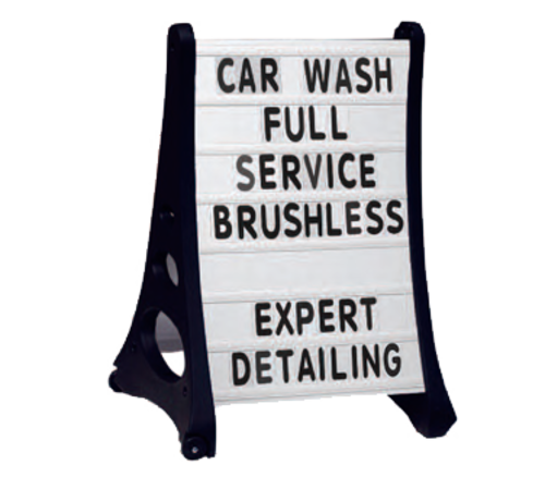 Roll A-Frame™ Sidewalk Sign, 24"W x 36"H (board only), 26-1/2"L x 24"W x 42" (overall length), with wheels, double sided, bright white 7 line changeable letter board, includes: set of (354) 4" characters (letters, numbers, and misc. symbols) weather resistant, plastic construction, black frame (assembly required)