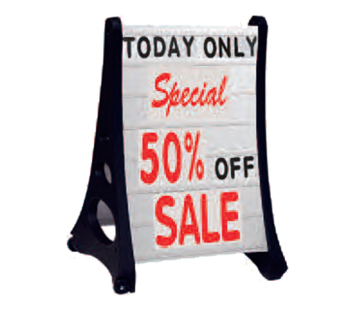Roll A-Frame™ Sidewalk Sign, 24"W x 36"H (board only), 26-1/2"L x 24"W x 42"H (overall length), with wheels, double sided, bright white 7 line changeable letter board, includes: (1) set of (354) 4" characters, (1) Deluxe Set which includes: (all in red) (2) 8" Sale insert, (2) 8" Special Sale insert, (2) each numbers 0-9, and (2) % symbols (8" inserts cover 2 lines on board) (assembly required) (8" inserts cover 2 lines on board) (assembly required)