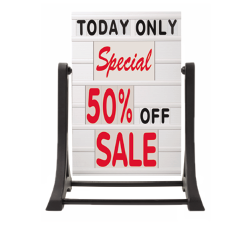The Rocker™ Sidewalk Sign 24"W x 36"H (board only), 32"L x 22"W x 42"H (overall length), double sided, durable frameless, white 7 line high contrast changeable letter board, weather resistant, rocking motion generated by wind, included: (1) set of (354) 4" characters, (1) Deluxe Set which includes: (all in red) (2) 8" Sale insert, (2) 8" Special Sale insert, (2) each numbers 0-9, and (2) % symbols (8" inserts cover 2 lines on board) (assembly required)