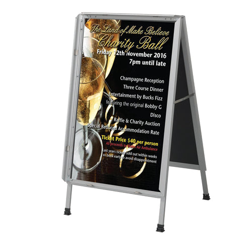 Snapframe Sidewalk Board, 22" x 28", A-frame, spring loaded flip open/snap close, plastic camel feet level, aluminum frame, satin anodized finish