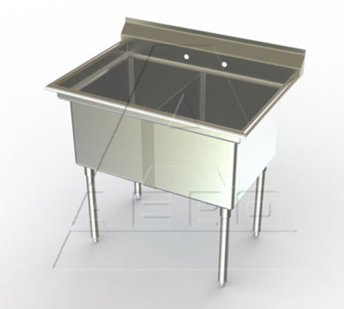 Delux™ Sink, two compartment, 59-1/2"W x 27"D x 39-1/2"H, 16/304 stainless steel construction, (2) 27" wide x 21" front-to-back x 14" deep fabricated compartments, 7"H backsplash, 8" OC splash mount faucet holes, raised rolled edges on front & sides, fully welded stainless steel gussets, 16/304 stainless steel legs with adjustable stainless steel feet, Aero Hemmed Safety Edge™, KD, NSF