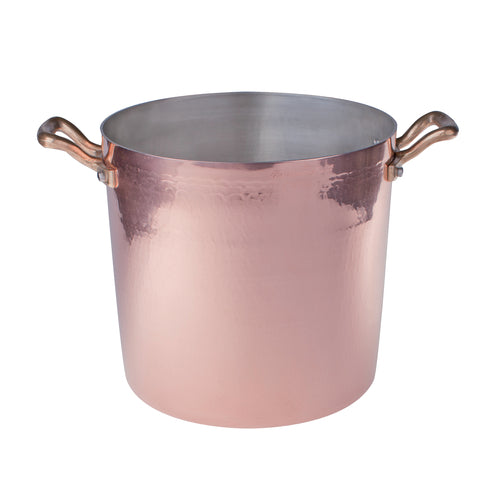 Stock Pot, 8.88 qt., 8-11/16" dia. x 8-7/16"H, round, without cover, insulated brass handles with stainless steel rivets, gas/electric/radiant safe, tin lined interior, 1/16" thick copper, hammered finish (Italy Stocked)