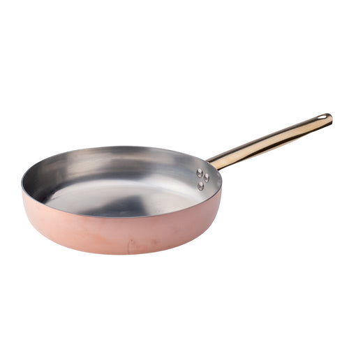 Fry Pan, 15-3/4" dia. x 2-15/16"H, round, insulated tubular riveted brass handle, gas/electric/radiant safe, 1/16" thick, tin lined interior, copper exterior (Italy Stocked)