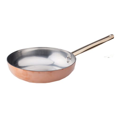Sauté Pan, 14-3/16" dia. x 3-1/8"H, round, without cover, insulated tubular riveted brass handle, gas/electric/radiant safe, 1/16" thick, tin lined interior, copper exterior (Italy Stocked)