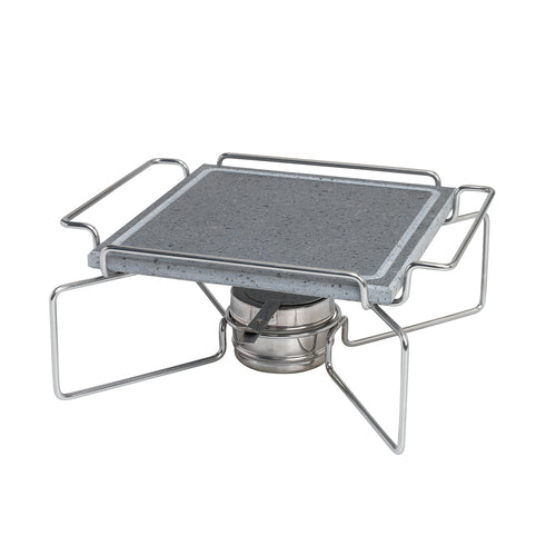 Stone Plate, 9-13/16", square, stainless steel handles, 18/10 stainless steel holder, fuel can bracket, 3/8" thick (Italy Stocked)