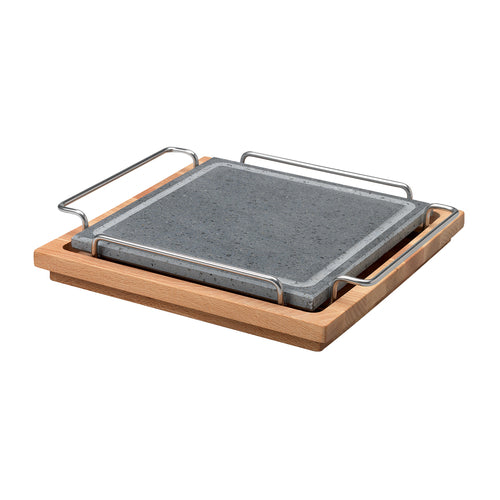 Stone Plate, 9-13/16", square, stainless steel handles, 18/10 stainless steel holder, 3/8" thick (Italy Stocked)