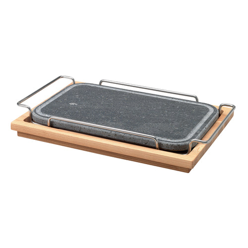 Stone Plate, 9-13/16" x 13-3/4", rectangular, rounded corners, stainless steel handles, 18/10 stainless steel holder, wood base, 3/8" thick (Italy Stocked)