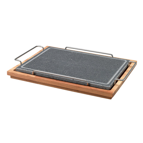 Stone Plate, 11-7/16" x 15-3/4", rectangular, stainless steel handles, 18/10 stainless steel holder, wood base, 3/8" thick (Italy Stocked)