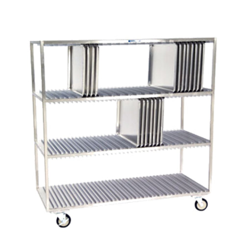 Tray Drying Rack, 74-1/2" high, three tiers, 120 tray capacity, 40 slots per shelf, adjustable shelves, tubular posts, aluminum construction, (4) 5" non-marking casters, shipped knocked down
