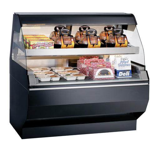 Halo Heat® Heated Two-Tier Display Case with European Style Base, 48" L, self-service, open front, curved glass style, (2) lights over both top heated shelf & (2) lower heated shelves, thermostatic controls, glass sliding rear doors, 10" x 36" rear work shelf, stainless steel interior, black exterior, EcoSmart®, cULus, UL EPH Classified, CE, TUV NORD, EAC
