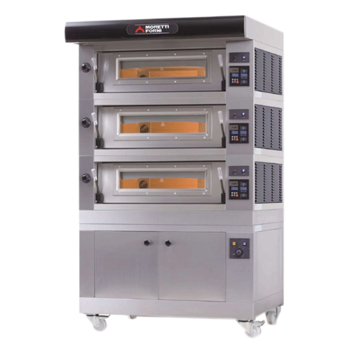 Moretti Forni Pizza Oven, deck-type, electric, (3) 26"W x 41"D x 7"H decks, (18) 12" or (6) 18" pizza capacity, (20) customizable programs (per deck), 840°F max operating temperature with electronic temperature, timer, (3) stainless steel bottom-hinged doors, halogen lighting, refractory brick baking chamber (entire camera), stainless steel construction, 23.1kW, CE, ETL, ETL-Sanitation, Made in Italy