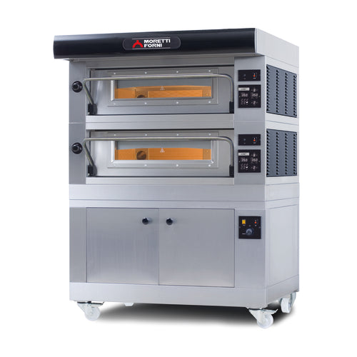 Moretti Forni Pizza Oven, deck-type, electric, (2) 38"W x 41"D x 7"H decks, (18) 12" or (8) 18" pizza capacity, (20) customizable programs (per deck), 840°F max operating temperature, timer, (2) stainless steel bottom-hinged doors, halogen lighting, refractory brick baking chamber (entire camera), stainless steel construction, 21.0kW, CE, ETL, ETL-Sanitation, Made in Italy