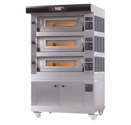 Moretti Forni Pizza Oven, deck-type, electric, (3) 38"W x 41"D x 7"H decks, (27) 12" or (12) 18" pizza capacity, (20) customizable programs (per deck), 840°F max operating temperature, timer, (3) stainless steel bottom-hinged doors, halogen lighting, refractory brick baking chamber (entire camera), stainless steel construction, 31.5kW, CE, cETLus, ETL-Sanitation, Made in Italy
