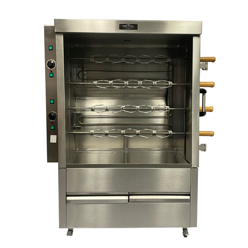 Metal Supreme Rotisserie Oven, electric, (4) stainless steel skewers, (20) chicken capacity, (20) chickens/hr average productivity, tempered-glass sliding doors, stainless steel front, sides & interior cavity, (2) stainless steel grease drawers, 3” casters, 220v/60/1-ph, 32 amps, 6,000 watts