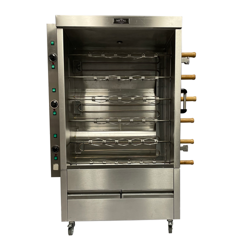 Metal Supreme Rotisserie Oven, electric, (6) stainless steel skewers, (30) chicken capacity, (30) chickens/hr average productivity, tempered-glass sliding doors, stainless steel front, sides & interior cavity, (2) stainless steel grease drawers, 3” casters, 220v/60/1-ph, 50 amps, 9,000 watts