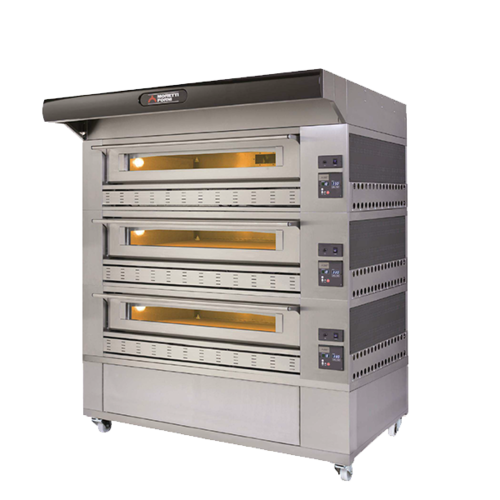 Moretti Forni Pizza Oven, triple deck, natural gas, (3) 58" x 34" decks, (36) 12" or (15) 18" pizza capacity, 840°F max operating temperature, (2) stainless steel doors, aluminized steel interior top & sides, two-layer refractory brick cooking surface, stainless steel exterior, 330,000 BTU/hr, 96.0kW, 240v/60/1-ph, Made in Italy, CE, cETLus, ETL-Sanitation
