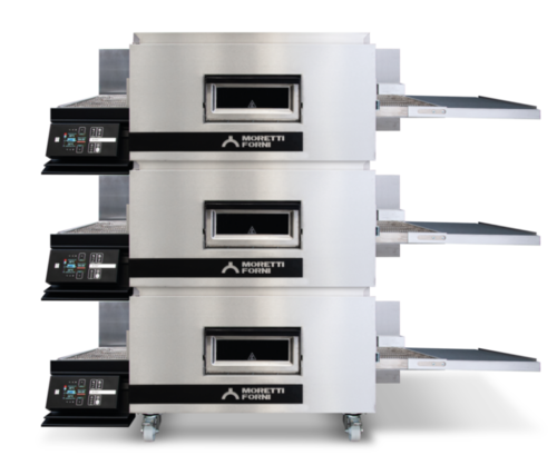 Moretti Forni Electric Conveyor Pizza Oven, 81"W x 60"D x 48-1/4"H, 25-3/4"W belt, triple deck, (00) 13" pizzas/hour or (38) 18” pizzas/hour, stand included, 2 to 30 minutes belt control, 608°F max operating temperature, color multi language display, (100) customizable programs, stainless steel construction, 17.8kW, cETLus, ETL-Sanitation, Made in Italy (2 Units stackable, independent connections)