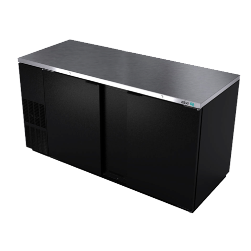 (19073705) Back Bar Cooler, 69-1/2"W x 28-5/8"D x 36-7/8", self-contained refrigeration, two-section, (2) solid doors, (1,014) 12 oz can capacity, (4) adjustable coated wire shelves, electronic controller, fluorescent interior light, temperature from 33° to 38°F, stainless steel top, black vinyl exterior, galvanized interior with stainless steel floor, R-290 hydrocarbon refrigerant, 1/3 HP, cETLus, ETL-Sanitation, Made in North America