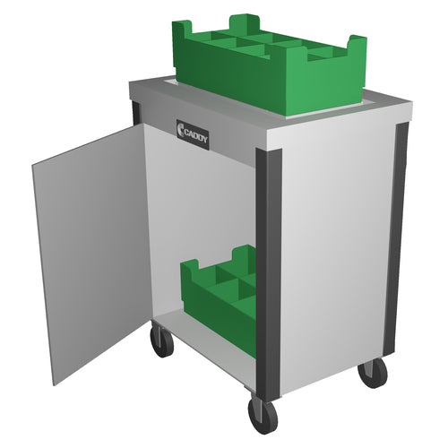 Caddy Magic Cup/Glass Rack Dispenser, cabinet style with door, unheated, for 10" x 20" racks, capacity up to (70) cups or (95) glasses, self-leveling platform, plastic vertical corner bumpers, 4" swivel casters, NSF