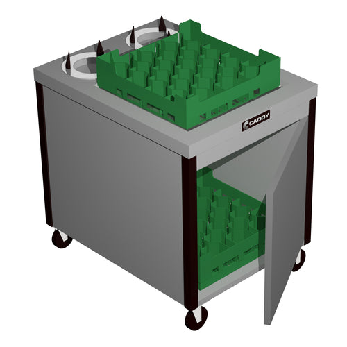 Caddy Magic Cup/Saucer Rack Dispenser, cabinet style with door, unheated, for 20" x 20" racks, capacity up to (140) cups & saucers (up to 5-3/4" dia.), self-leveling platform, (2) adjustable cylinder dispensers, plastic vertical corner bumpers, 4" swivel casters, NSF