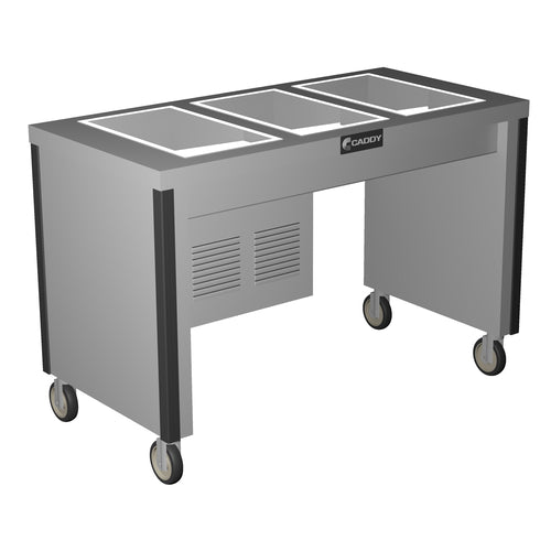 Cold Pan Unit, electric, 52"W x 26"D x 34-1/2"H, open base, (3) 12" x 20" openings (20" front to back), stainless steel construction, vertical corner bumpers, 4" heavy duty swivel casters (2 with brakes), 120v/60/1-ph, 5.8 amps, 1/4 hp, self-contained refrigeration, cord with plug, NEMA 5-15P, ETLus, NSF (contact factory for price)