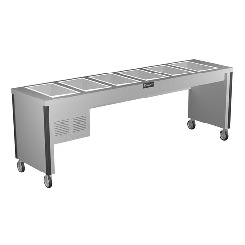 Cold Pan Unit, electric, 97"W x 26"D x 34-1/2"H, open base, (6) 12" x 20" openings (20" front to back), stainless steel construction, vertical corner bumpers, 4" heavy duty swivel casters (2 with brakes), 120v/60/1-ph, 8.8 amps, 1/2 hp, self-contained refrigeration, cord with plug, NEMA 5-15P, ETLus, NSF (contact factory for price)