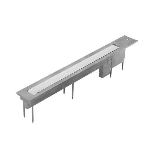 Tray Make-Up Conveyor, custom length per spec, variable speed, PVC belt, limit switch, skirting, (provide plate or tray size), for trays up to 17" wide, stainless steel bed & legs with adjustable bullet feet, 1/4 HP, ETLus, NSF (contact factory for price)