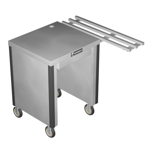 Cashier Caddy, 36-1/4"W x 37"D x 34"H, folding tray slide on right, foot rail, locking cash drawer with currency/coin compartments, stainless steel top with hole for cord, plastic corner bumpers, 4" swivel casters with brakes, NSF