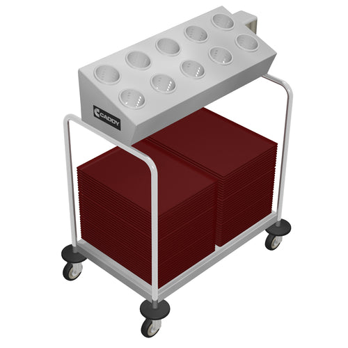 Tray & Silver Caddy, 34-1/2"W x 22-1/2"D x 45"H, double stack, (10) cylinder-type silverware dispensers, shelf holds (190) trays up to 15" x 20", stainless steel tubular frame, rounded edges, 4" heavy duty swivel casters, NSF
