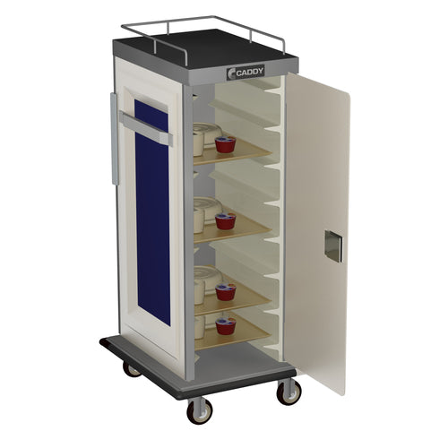 Tray Delivery Truck, (1) door, 1-compartment, non-insulated, capacity (8) trays, formed tray slides with 2" clearance, stainless steel push handle, card holder, super-impact polymer construction, stainless steel top, bottom & back, full perimeter non-marking bumper, 6" polyurethane casters (2 swivel & 2 rigid), NSF