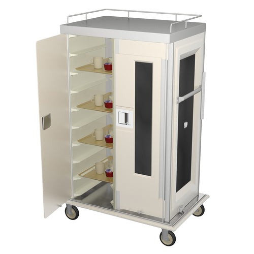 Tray Delivery Truck, (2) door, 2-compartment, non-insulated, capacity (20) trays, formed tray slides with 2" clearance, stainless steel push handle, card holder, super-impact polymer construction, stainless steel top, bottom & back, full perimeter non-marking bumper, 6" polyurethane casters (2 swivel & 2 rigid), NSF