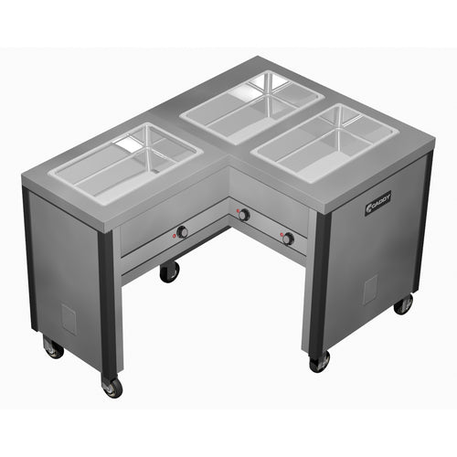 Hot Food Caddy, electric, open base, (3) 12" x 20" x 6-3/8" deep hot food wells, L-shaped, left-handed, insulated wells with individual heat controls, stainless steel construction, vertical corner bumpers, 4" swivel casters (2 with brakes), ETLus, NSF