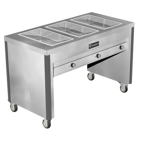 Hot Food Caddy, electric, open base, 52"W x 26"D x 34"H, (3) 12" x 20" x 6-3/8" deep hot food wells, insulated wells with individual heat controls, tilted control panel, stainless steel construction, vertical corner bumpers, 4" swivel casters (2 with brakes), ETLus, NSF