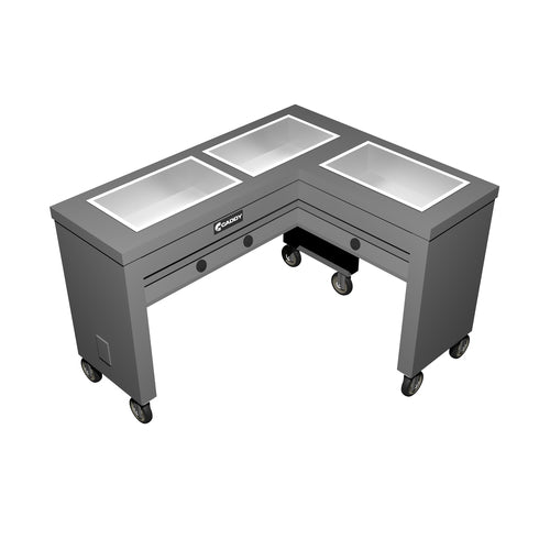 Hot Food Caddy, electric, slimline, open base, (3) 12" x 20" x 6-3/8" deep hot food wells, L-shaped, right-handed, insulated wells with individual heat controls, stainless steel construction, vertical corner bumpers, 4" swivel casters (2 with brakes), ETLus, NSF