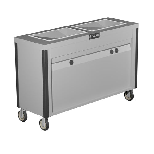 Hot Food Caddy, electric, slimline, enclosed heated base, 53"W x 18"D x 34"H, (2) 12" x 20" x 6-3/8" deep hot food wells, insulated wells with individual heat controls, (2) compartments accommodate (8) full size 2-1/2" deep pans, stainless steel construction, vertical corner bumpers, 4" heavy duty swivel casters (2 with brakes), ETLus, NSF