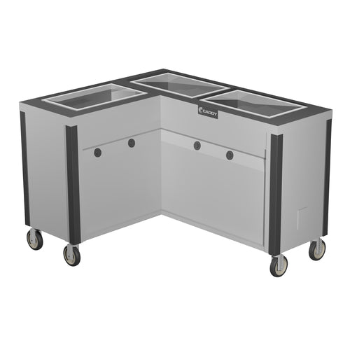 Hot Food Caddy, electric, slimline, enclosed heated base, (3) 12" x 20" x 6-3/8" deep hot food wells, L-shaped, left-hand, insulated wells with individual heat controls, (2) compartments accommodate (8) full size 2-1/2" deep pans, stainless steel construction, vertical corner bumpers, 4" swivel casters (2 with brakes), ETLus, NSF
