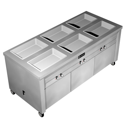 Hot Food Caddy, electric, enclosed heated base, 76"W x 33"D x 34"H, (6) 12" x 20" x 6-3/8" deep hot food wells, insulated wells with individual heat controls, (3) compartments accommodate (12) full size 2-1/2" deep pans, stainless steel construction, vertical corner bumpers, 4" swivel casters (2 with brakes), ETLus, NSF