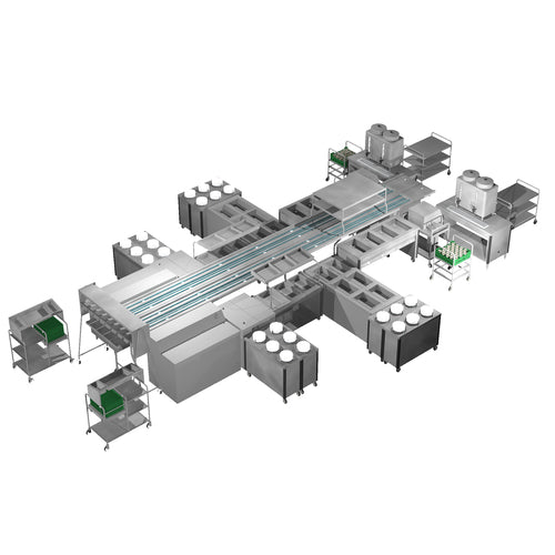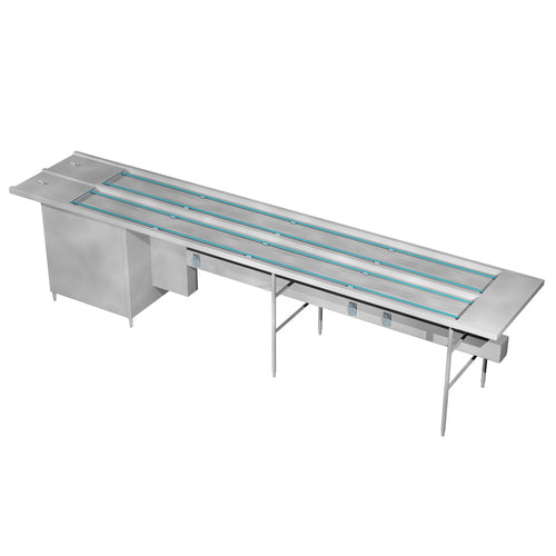 Express Line Tray Make-Up Conveyor, 42-1/2" high, custom length per spec, variable belt speed from 5-40 feet per minute, DURA-SAN belt, manual controls with on-off & limit switches, stainless steel conveyor bed & legs with adjustable bullet feet, accommodates flat bottom trays up to 15" wide (provide tray size), ETLus, NSF (contact factory for price)