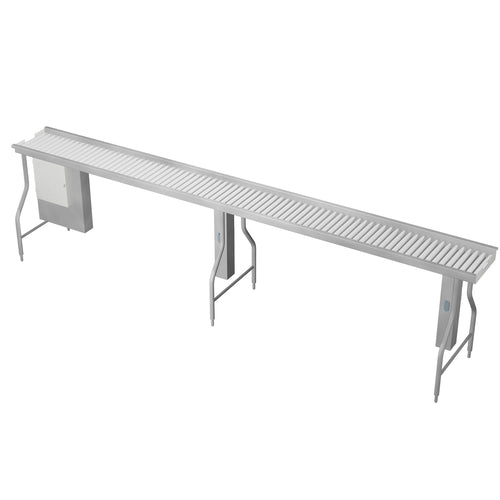Express Line Tray Make-Up Conveyor, 42-1/2" high, custom length per spec, non-powered roller conveyor, 1-1/4" plastic rollers with stainless steel balls in nylon bearings on 3" centers, raised curbing, stainless steel solid pan accommodates trays up to 16" wide (provide tray size), stainless steel tubular legs with adjustable bullet feet, ETLus, NSF (contact factory for price)
