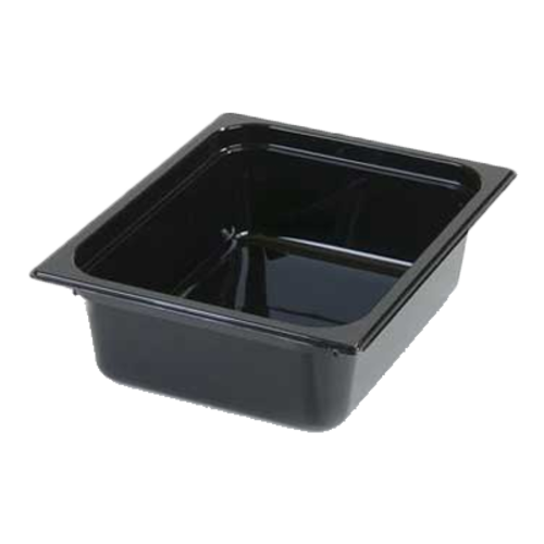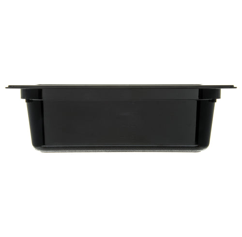 StorPlus™ Food Pan, 1/2 size, 5.5 qt. capacity, 12-3/4" x 10-19/50" x 4" deep, molded-in capacity indicators, temperature range: -40° - 212° F, reinforced top & bottom corners, spoonable bottom, dishwasher safe, smooth interior finish, textured non-slip exterior finish, polycarbonate, black, NSF, Made in USA