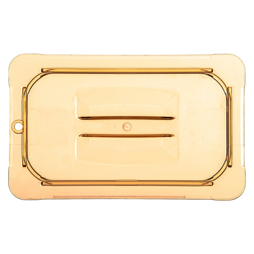 StorPlus™ High Heat Universal Lid, for 1/4-size food pan, handled, solid, stackable, temperature range: -40° to 380°F, dishwasher safe, textured non-slip finish, polyether sulfone, amber, BPA free, NSF, Made in USA