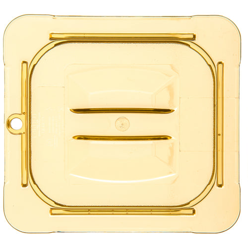 StorPlus™ High Heat Universal Lid, for 1/6-size food pan, handled, solid, stackable, temperature range: -40° to 380°F, dishwasher safe, textured non-slip finish, polyether sulfone, amber, BPA free, NSF, Made in USA
