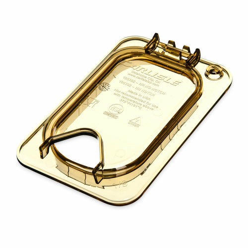 StorPlus™ EZ Access High Heat Universal Lid, 1/9 size, hinged, notched, with peg hole & handle, temperature range: -40°F - 380°F, microwave & dishwasher safe, plastic, amber, NSF, Made in USA