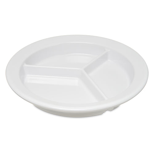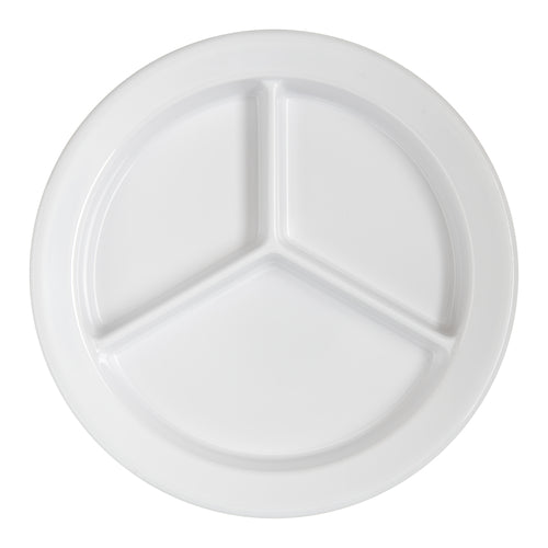 Dallas Ware® Compartment Plate, 9" dia., 3 compartments, reinforced rim and foot, dishwasher safe, resists drawing heat or cold away from food, stackable, melamine, white, BPA Free, NSF