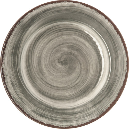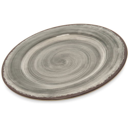 Mingle™ Dinner Plate, 11" dia., swirl design, dishwasher safe, stain and chip resistant, resists drawing heat or cold away from food, reinforced rim and foot design, stackable, safe for temperatures up to 212°F, melamine, smoke gray, BPA Free, NSF