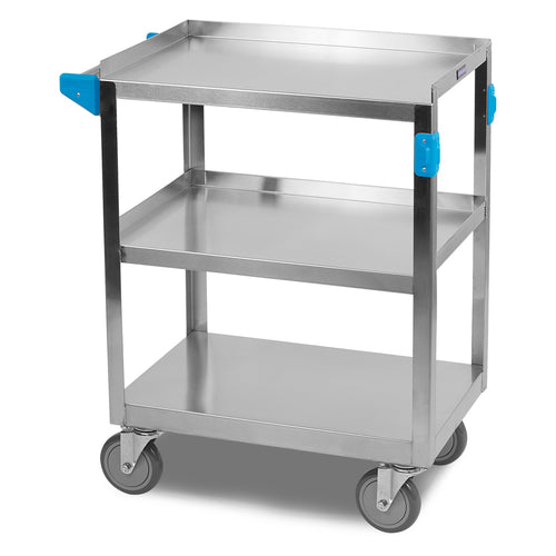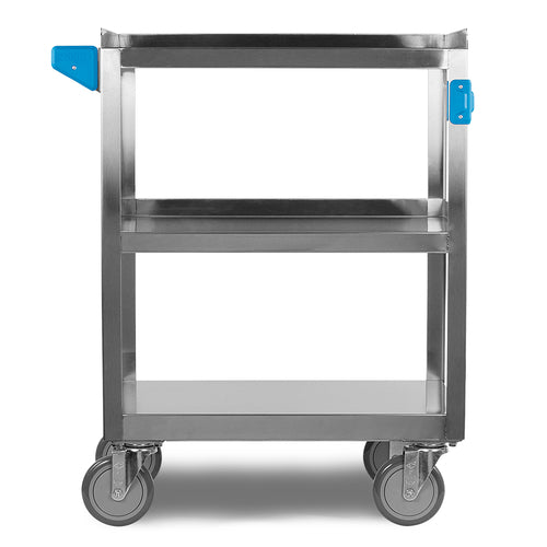 Utility Cart, 300 lb. capacity, 24"L x 15-1/2"W x 32-1/2"H, open design, (3) shelves, (2) with raised edges, (1) push handle, non-marking soft rubber bumpers, tig welded, (4) casters, 18/10 stainless steel (26-3/4" OA length with handle)