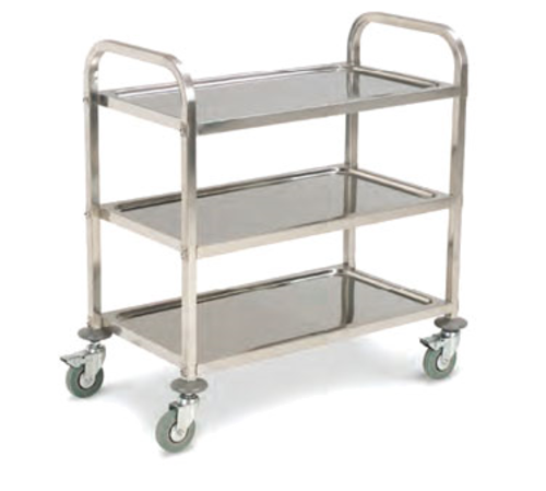 Utility Cart, 400 lb. capacity, 33-3/8"L x 15-5/8"W x 33-1/2"H, open design, (3) shelves, (2) push handles, non-marking soft rubber bumpers, (4) casters, 18/10 stainless steel, KD (Made to order, 5 each minimum order, contact factory for details)