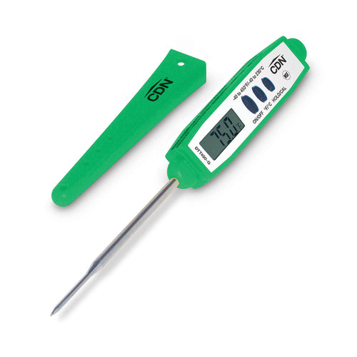 Thin Tip Pocket Thermometer, -40 to +450°F (-40 to +230°C), 6 second response, 7/8"W x 5/16"H (2.2 x 0.8cm) display, 1.5 mm thin tip, 2-3/4" (7.0 cm) stem, field calibration, waterproof, high heat, shatterproof, expanded range, data-hold, big digit, temperature guide on thermometer, on/off button, auto-off after 10 minutes, sheath can be used as handle extension, pocket clip/hook, requires (1) LR44 battery (included), food-safe ABS plastic with BioCote®, 304 stainless steel stem, green, NSF