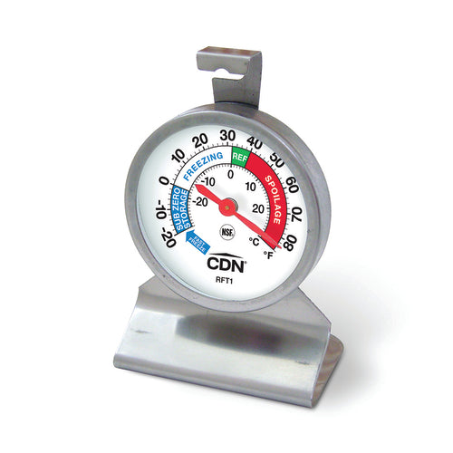 Heavy Duty Refrigerator/Freezer Thermometer, Fahrenheit reading, -20 to +80°F (-30 to +30°C), 2" (5.1cm) dial, target range indication, temperature guide on thermometer, stand/hang, laboratory glass lens, 304 stainless steel housing, NSF