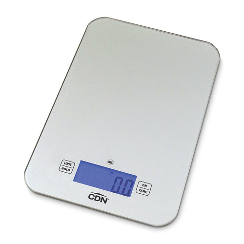 Digital Portion Control Scale, 6"W x 9-3/16"D x 5/8"H overall, 6" x 9-3/16" rectangular platform, 2-1/4"W x 1"H display, 15 lb x 0.1 oz/ 7 kg x 1 g capacity, tare function, data hold, tempered glass platform, selectable units, overload indication, backlit display, battery status indicator, on/off button, auto-off, requires: (2) 3v IEC CR2032 batteries (included), plastic housing, silver, NSF